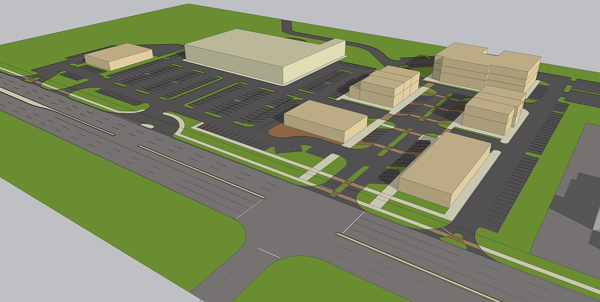 The client approached me with a massing plan for a grocery store and "town square" style mixed-use area to be developed along a busy traffic corridor in the Hudson Valley region of NY. The location is adjacent to a golf course community, so the client wanted a "Whole Foods" style upscale grocery store to set the tone of the development.