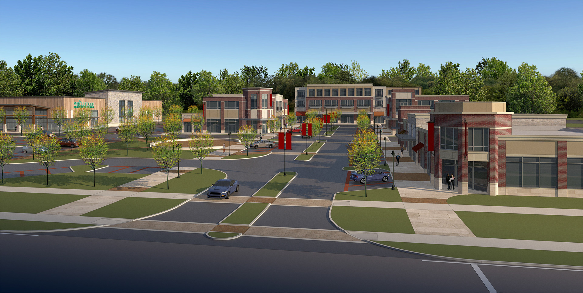 The client suggested that we use a different vocabulary for the shopping center to differentiate it from the WF location, so this design was developed, going with a more traditional vocabulary and material palette. We also eliminated the foreground retail building to allow better visual connection between the two portions of the development.